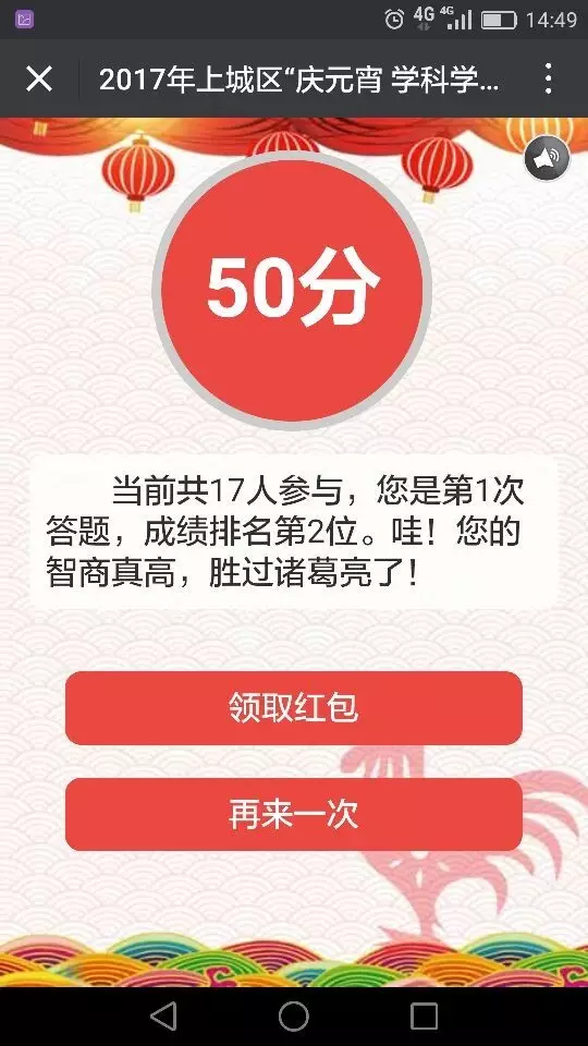 领取红包后,分享到朋友圈,只要有一人点击链接参与答题,您就可以再次答题抢红包哦(最多一次)